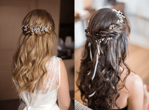 Kiểu tóc này chính là lựa chọn an toàn và cổ điển nhất cho nàng. Suối tóc mây bồng bềnh, màu nâu socola, nâu đậm hoặc ánh chút tím sẽ mang đến cho cô dâu vẻ đẹp trong sáng thuần khiến như trong truyện tranh.