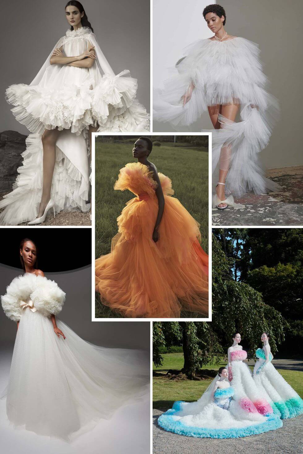 Từ trái qua: Ashi Studio Fall 2021; Khu nghỉ dưỡng Carolina Herrera năm 2021; Kaviar Gauche Bridal năm 2021; Giambattista Valli Thời trang cao cấp mùa thu 2020; Tomo Koizumi Bridal Spring 20