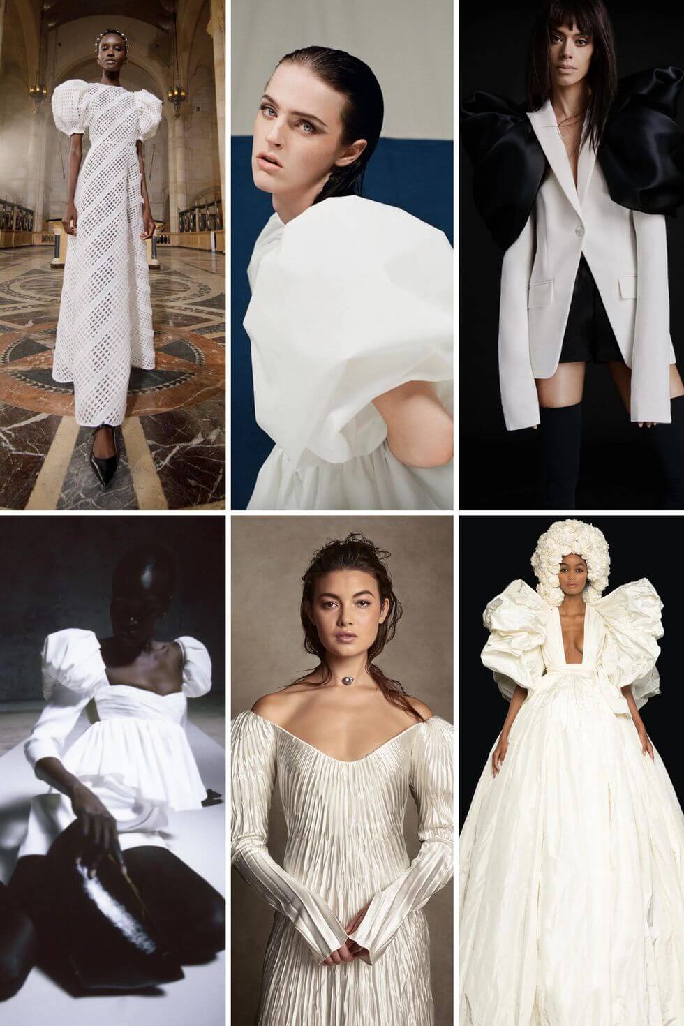 Từ trái qua: Simone Rocha Spring 2021; Khu nghỉ dưỡng Carolina Herrera năm 2021; Mùa xuân Markarian 2021; Kaviar Gauche Bridal năm 2021; Chanel Xuân 2020 Haute Couture; Alexander McQueen mùa xuân năm 2021.