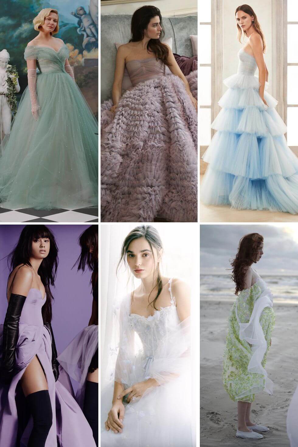 Từ trái qua: Carolina Herrera Spring 2021; Christopher John Rogers Mùa xuân năm 2021; Vera Wang mùa thu năm 2021; Khaite Spring 2021; Danielle Frankel Fall 2020, Valentino Fall 2020 Haute Couture.