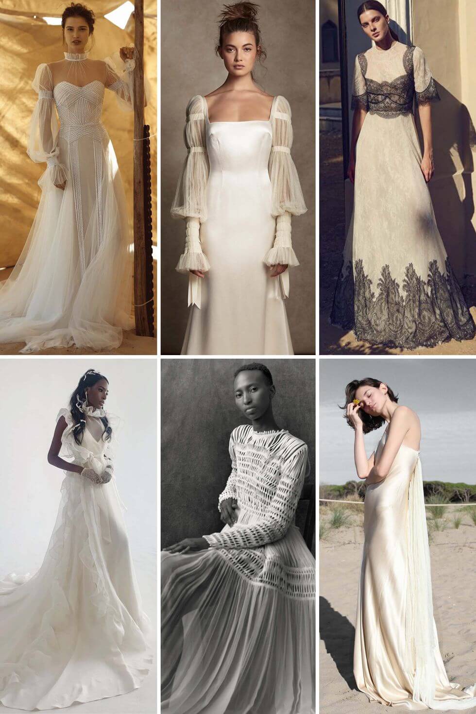 Từ trái qua: Andre Iyamah Bridal Fall 2020; Monique Lhuillier Bridal Fall 2020; Elie Saab Bridal Spring 2021; Valentin Avoh Bridal Fall 2020; Danielle Frankel Bridal Fall 2020; Cecilie Bahnsen mùa xuân năm 2021.