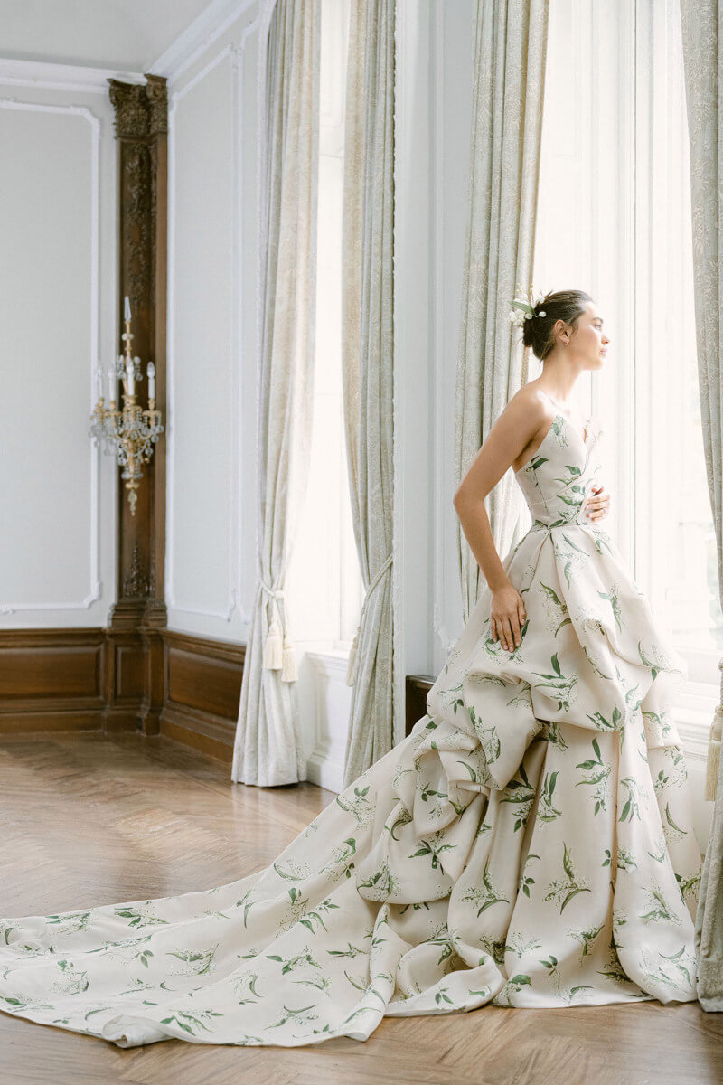Váy cưới in, thêu họa tiết là điểm mới của xu hướng mùa cưới năm nay. Monique Lhuillier lăng xê đầm cúp ngực họa tiết lá xanh, Oscar de la Renta theo đuổi kiểu chấm bi và hoa đỏ, Miu Miu đem tới đầm xẻ ngực họa tiết nhân vật hoạt hình, ... Ảnh: Monique Lhuillier.