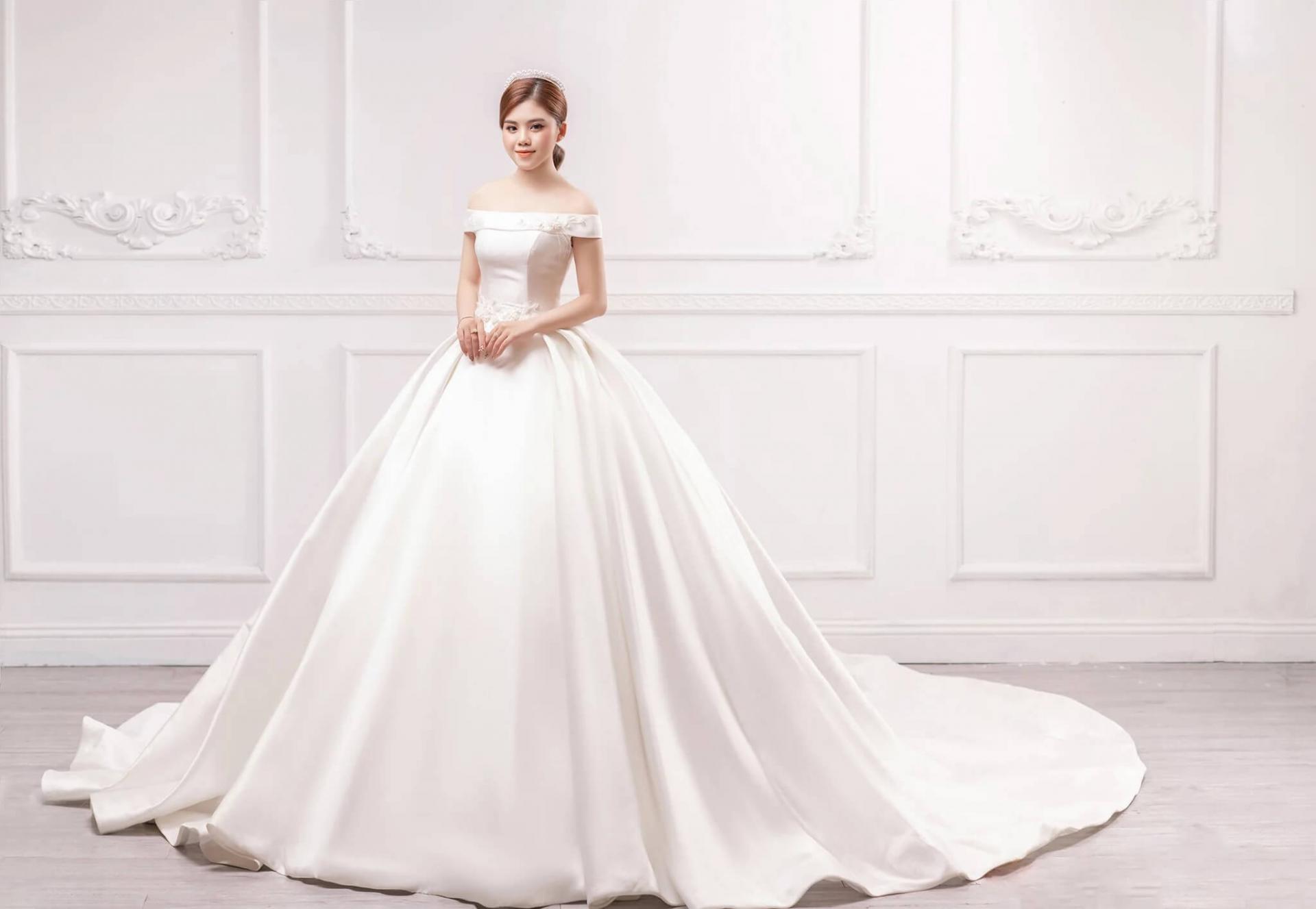 Váy cưới nhẹ nhàng với dáng trễ vai kết hợp chất liệu phi bóng – một trong những mẫu váy cưới được yêu thích nhất từ năm 2020 đến 2021. Chỉ cần một chút trễ vai để khoe nét đẹp riêng của phái nữ cũng đủ tạo nên sự sang trọng, kiêu sa.