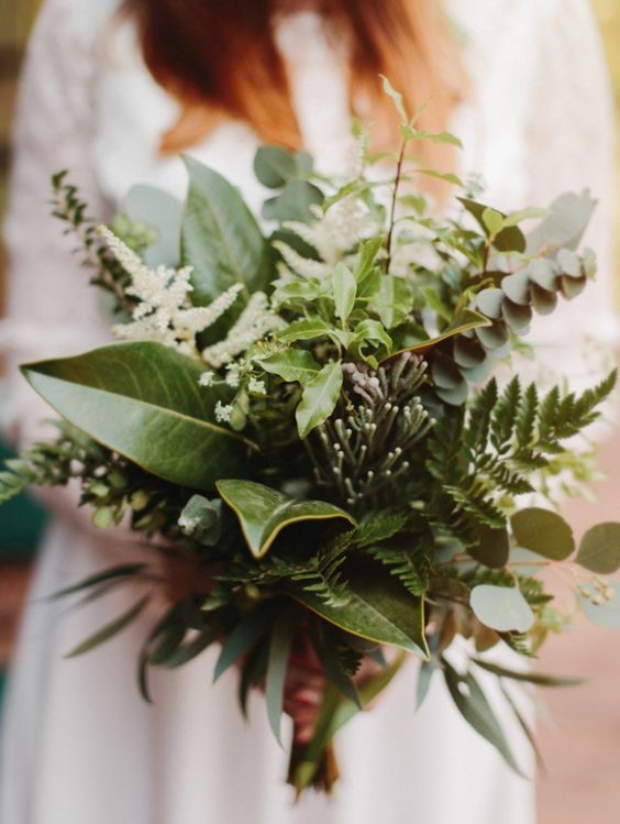 Đi cùng xu hướng green life trên thế giới, rất nhiều cô dâu ưa chuộng những bó hoa cưới không hề có sự xuất hiện của những bông hoa mà chỉ toàn là màu xanh cũng những chiếc lá xinh đẹp.