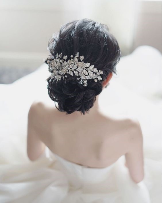 Kiểu tóc búi Chignon kết hợp cùng những phụ kiện như vương miện hay cài tóc đính đá càng khiến cô dâu nổi bật trong ngày trọng đại.