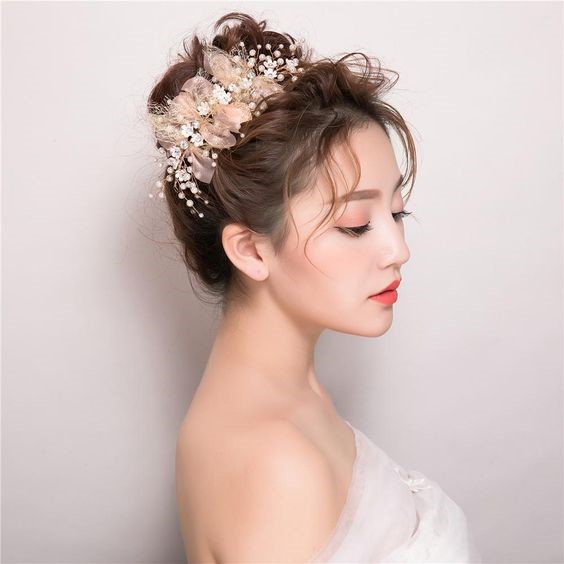 Với những mẫu váy với phần tùng xòe bồng lộng lẫy, các nàng dâu Hàn Quốc sẽ không ngần ngại lựa chọn tóc búi cao tôn lên chiếc cổ cao thanh tú và bờ vai thon gọn của các nàng dâu châu Á. Nếu cô dâu lựa chọn mẫu váy cưới có thiết kế trễ vai hay cúp ngực, kiểu tóc này còn giúp cô dâu khoe khéo xương quai xanh gợi cảm đầy cuốn hút.