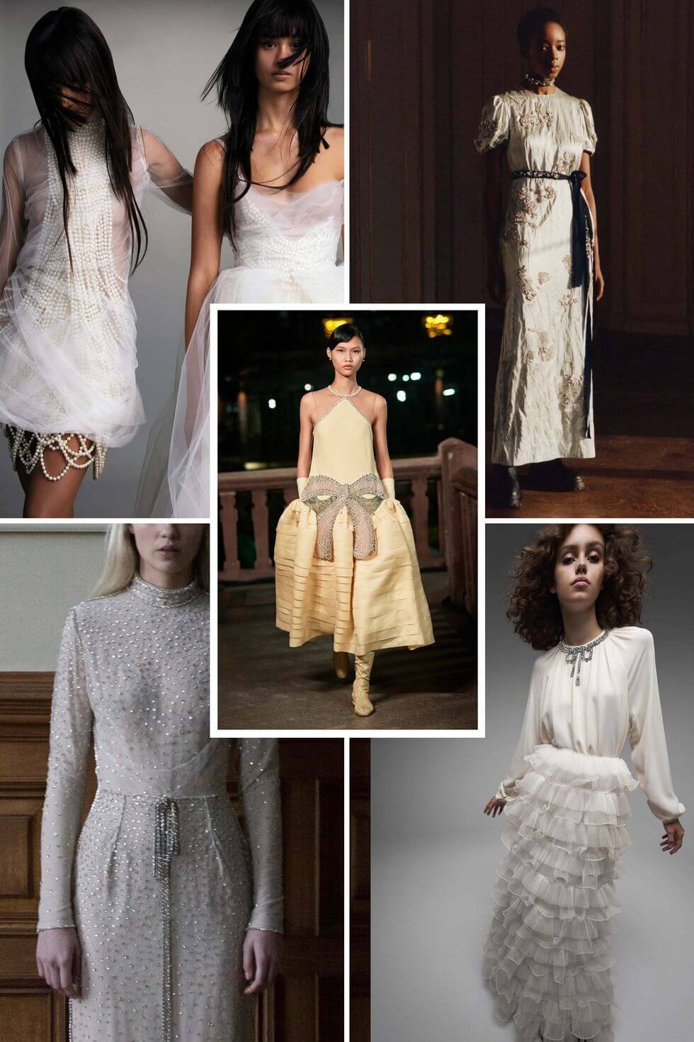 Từ trái qua: Ashi Studio Fall 2021; Khu nghỉ dưỡng Carolina Herrera năm 2021; Kaviar Gauche Bridal năm 2021; Giambattista Valli Thời trang cao cấp mùa thu 2020; Tomo Koizumi Bridal Spring 20