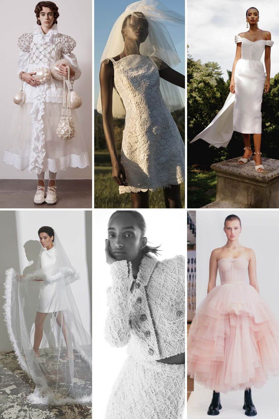 Từ trái qua: Simone Rocha Spring 2021; Khu nghỉ dưỡng Carolina Herrera năm 2021; Mùa xuân Markarian 2021; Kaviar Gauche Bridal năm 2021; Chanel Xuân 2020 Haute Couture; Alexander McQueen mùa xuân năm 2021.