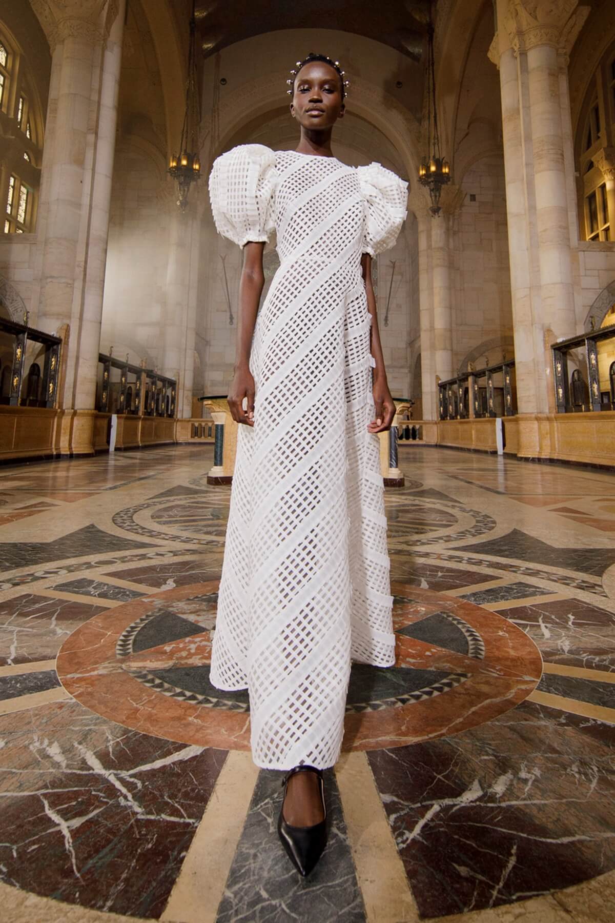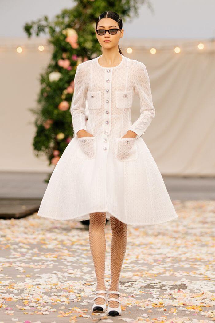 Đầm cưới của Chanel dáng chữ A làm từ vải lưới, kiểu cổ điển kết hợp giày Mary Jane. Ảnh: Chanel.