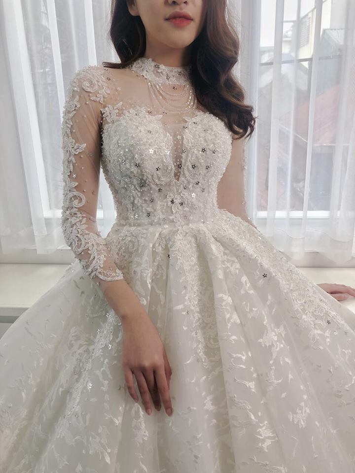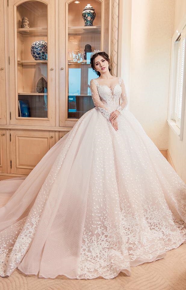 Váy cưới dài tay đã trở thành xu hướng gần đây khi được rất nhiều cô dâu lựa chọn, trong đó có cả những người nổi tiếng. Với phần tay ôm sát thường được làm từ ren và voan, chiếc váy sẽ trở nên mềm mại, thanh thoát và sang trọng hơn.