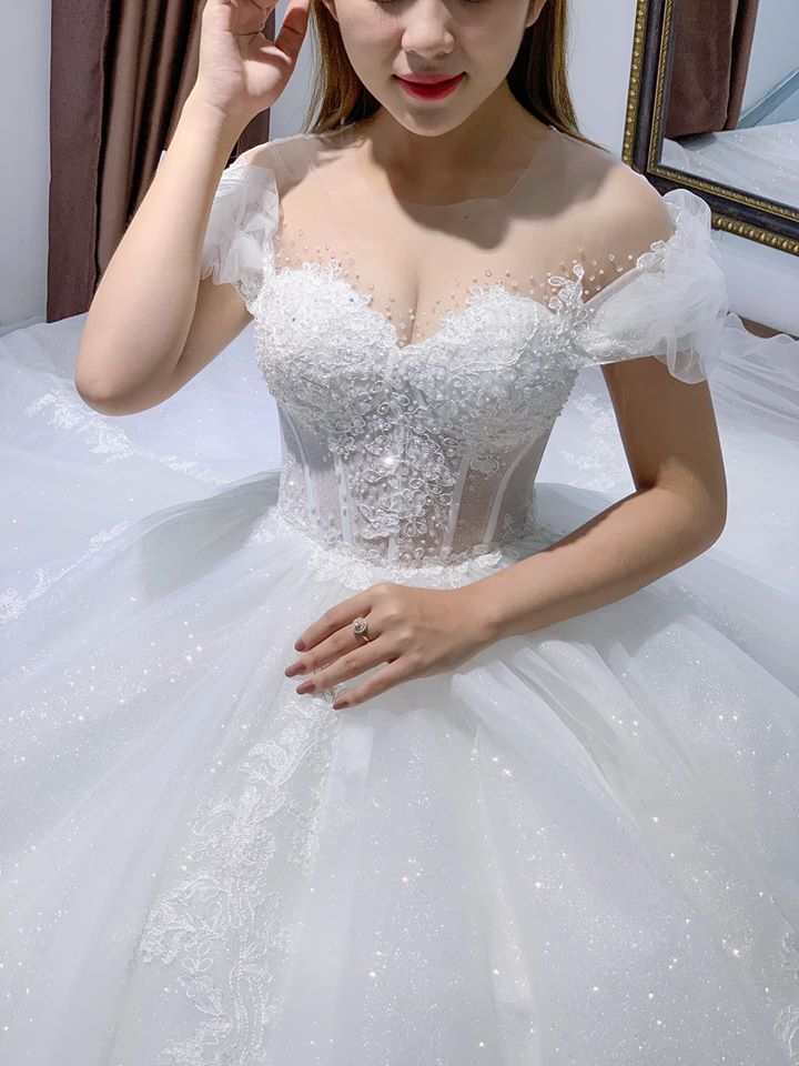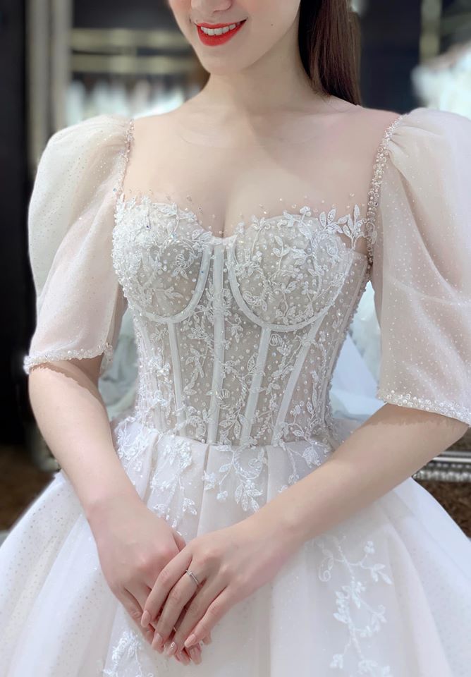 Đặc biệt, phần đuôi váy dài mang đến nét mềm mại và thướt tha theo từng bước di chuyển của cô dâu.