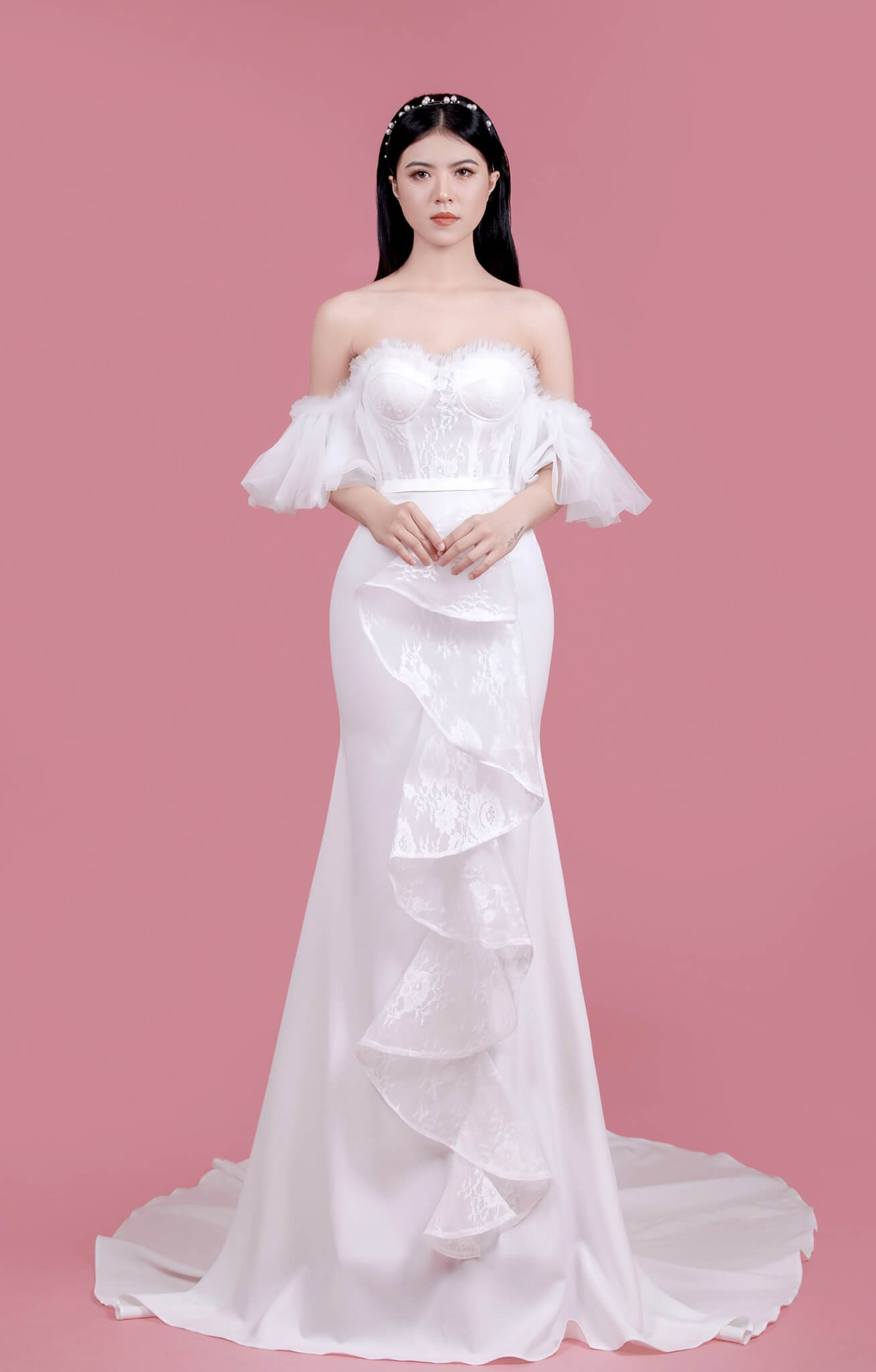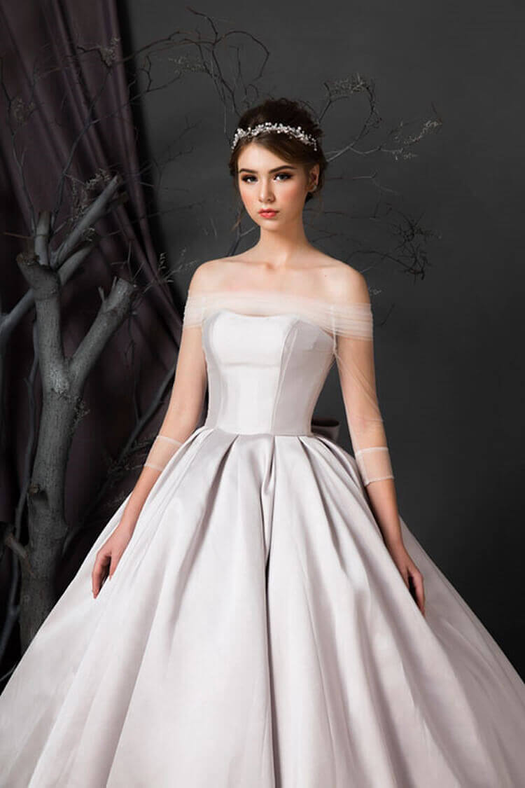 Với các nàng dâu yêu thích sự nhẹ nhàng, thanh lịch thì mẫu váy cưới trễ vai này là sự lựa chọn không thể bỏ lỡ.